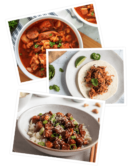 - Beef, pork, and chicken dishes in 25 to 40 minutes total (including unattended cooking time!)